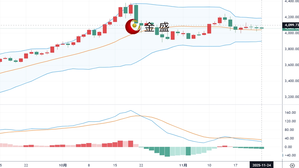 现货黄金周一(11月24日)开市于4070.68美元/盎司,盘中上扬至4077美元附近随后再次回落,但缺乏后续动能。因美联储官员暗示未来仍可能降息,使市场对12月政策会议的降息押注显著升温。同时,俄乌冲突稍有缓和的消息可能削弱风险溢价,进一步抑制避险黄金多头动能。