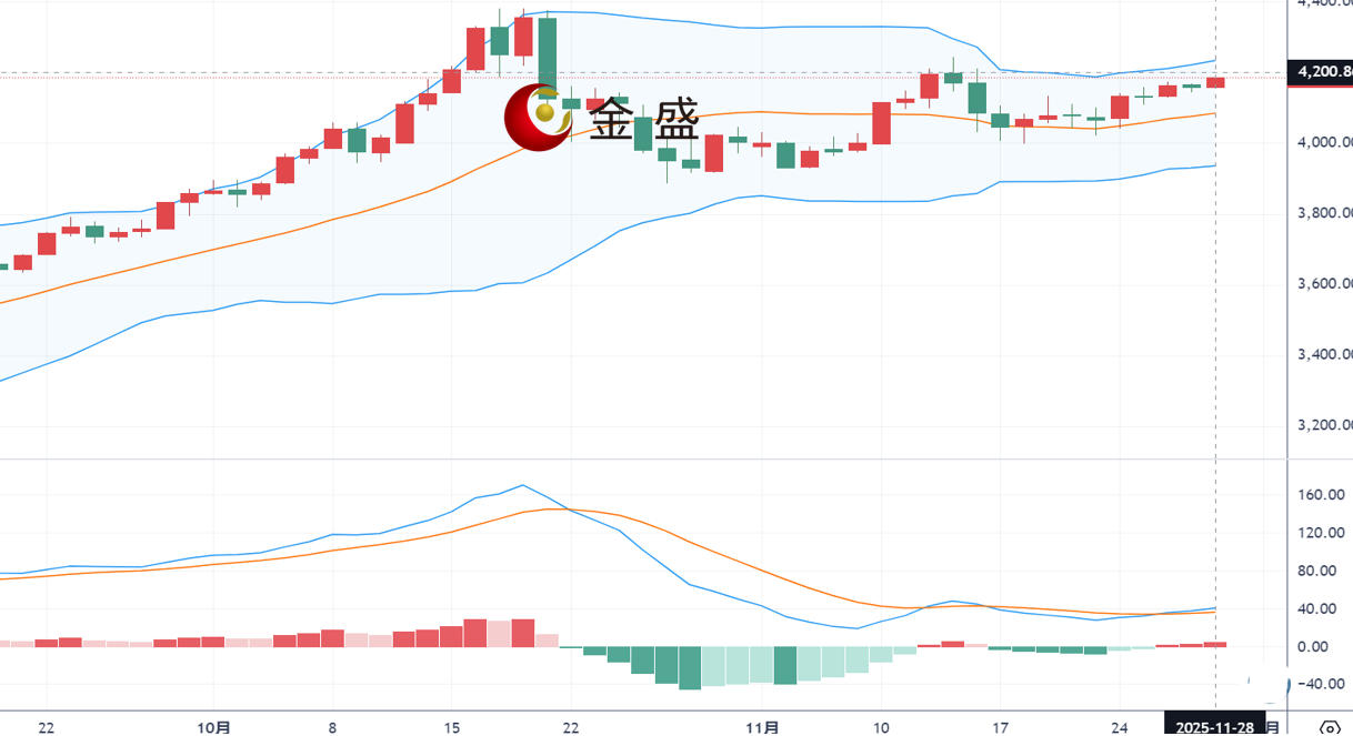 现货黄金隔日小幅走低,从上一交易日创下的近两周高点回落。因美国感恩节假期,市场交投清淡,市场密切关注美联储政策动向,特别是在哈西特成为接替鲍威尔担任美联储主席的热门人选后,主张降息的倾向引发市场广泛关注。截至目前,现货黄金小幅冲高,一度刷新两周高点,最高触及4191.23美元/盎司,最低至4151.35美元/盎司。