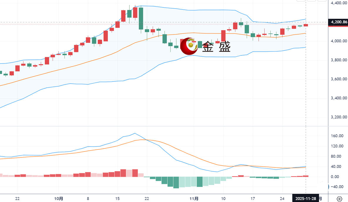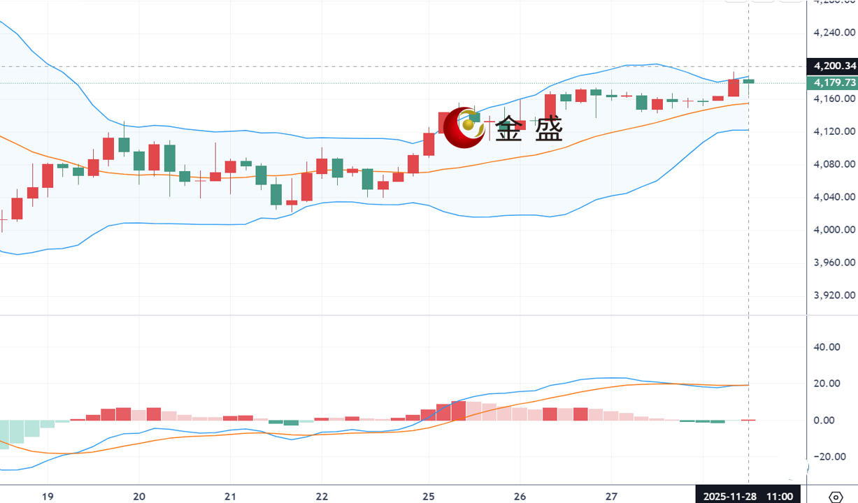 现货黄金周五(11月28日)开市于4158.69美元/盎司,盘中延续前一日涨势,一度逼近4200美元,但未能实现有效突破。美联储12月再次降息的可能性不断增加,这成为支撑这种无息贵金属价格的关键因素。然而,美元自低位反弹及风险偏好回升共同限制金价上行空间。