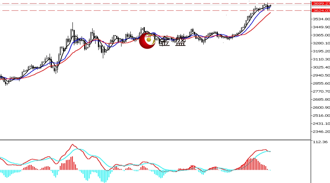 周线图,黄金延续涨势,当周波动逾八十美金,价格冲上3700美元一带,周线再收阳线。均线系统向上拐头,运行在价格下方形成支撑。MACD指标快慢线零轴上方运行,做多的动能有增强的迹象。黄金连续阳线走高,K线实体继续收窄,表明多头力度可能在放缓。短期关注3700一带的真假突破,一旦有效站稳,则上行空间再度打开。