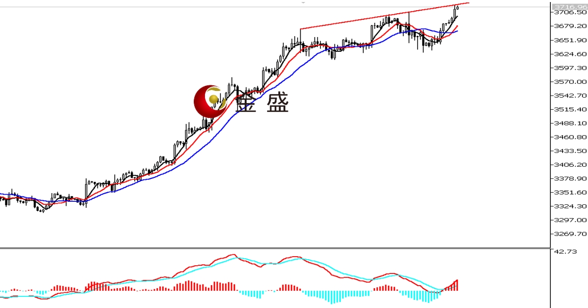 前一个交易日,美指延续反扑,日图连续三日收阳。黄金白盘区间整理,晚间单边上涨逾四十美金,最终收涨1.12%。今天白盘行情涨势不减,价格突破多个关口,午后创历史新高。四小时周期,均线系统收敛向上拐头,对价格上涨形成支撑。MACD指标快慢线零轴附近现金叉,做多的动能为主。黄金上涨趋势不变,价格突破上周高点,重新站上3700美元大关,但是否有效站稳还需时间确认。近期行情震荡的高点形成图示的压力线,日内关注3720美元一带能否阻碍多头的脚步,但不宜博弈空单,操作上调整做多为主。