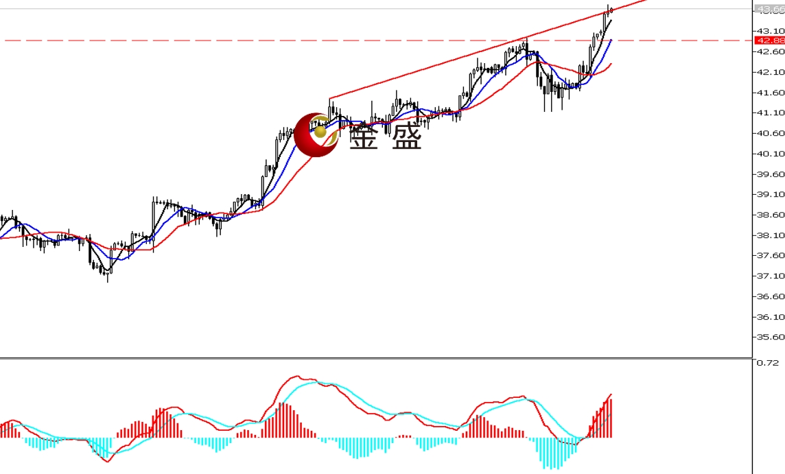 前一个交易日,白银走势与黄金同步,但上行力度更大,价格刷新年内新高至43美元一带,最终收涨2.94%。今天白盘行情延续涨势,午后价格涨势逾1.5%。四小时周期,均线系统收敛多头排列,对价格上行构成支撑。MACD指标快慢线零轴上方现金叉,做多的动能为主。白银上涨趋势不变,短期有加速上涨的迹象。近期高点形成图示的压力线,一旦突破,则下一个压力位看整数关口44美元一带。
