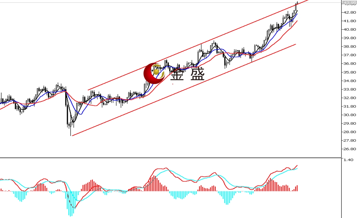 前一个交易日,早盘时段,白银开市即创当日低点43美元,价格短暂休整后转涨,欧盘围绕0.3美金的空间盘整。晚盘时段,行情小幅调整后再度上行,尾盘冲上44美元大关,最终再收阳线。均线系统多头排列,对价格上涨构成支撑。MACD指标快慢线零轴上方走平,做多的动能为主。白银上涨趋势不变,价格创新高的速度在加快,即行情进入加速上涨阶段,强势上行不言顶。行情自今年四月开始的上涨形成图示的通道结构,价格目前尝试突破通道上轨,短期关注44美元一带的K线反应,操作上调整做多为主。
