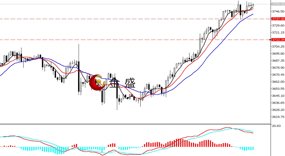 前一个交易日,美联储多名官员释放鹰派信号,美指震荡偏调整,日图结束连阳反弹。黄金单边上涨,当日拉升逾六十美金,最终收涨1.67%。今天白盘行情涨势略有放缓,价格创新高后走横盘震荡。小时周期,均线系统收敛向上拐头,对价格上涨形成支撑。MACD指标快慢线零轴上方现死叉,做空的动能为主。黄金维持强势上涨格局。近两日交易日拉升逾一百美金,且盘中无明显的调整。短线关注3770—3780区域的压力,如不能有效阻碍价格上行,则后市看3800美元关口的压力,操作上调整做多为主。