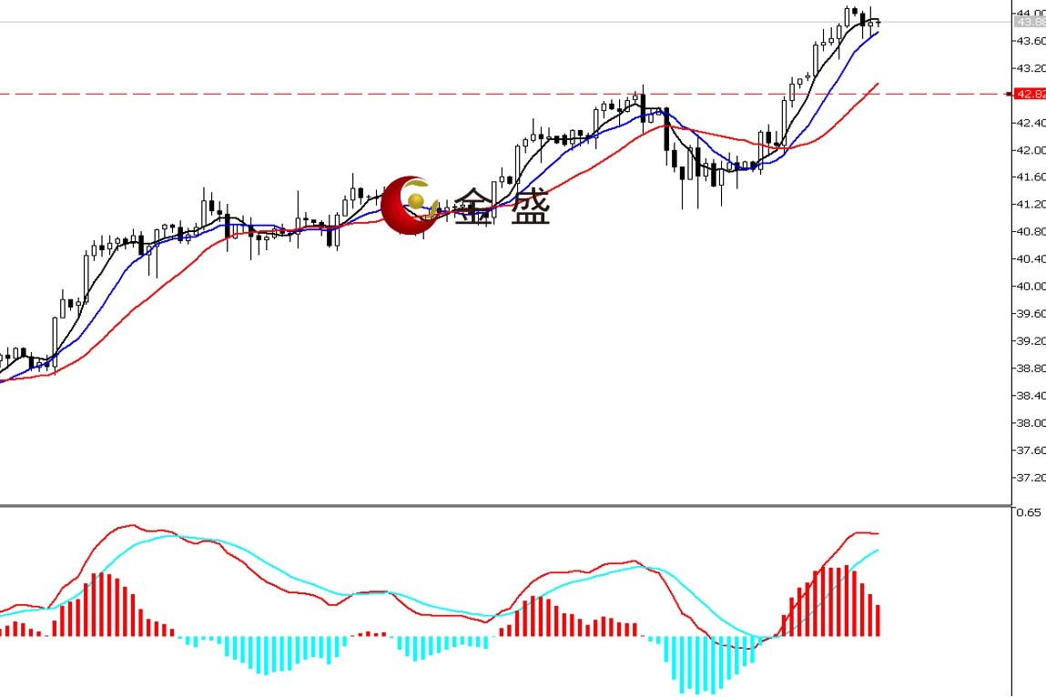 前一个交易日,白银与黄金表现同步,且维持领涨状态,价格冲上44美元关口,最终收涨2.38%。今天白盘行情有所调整,盘中回吐昨日部分涨幅,午后收窄日内跌幅,多空围绕44美元一带争夺。四小时周期,均线系统多头排列,短期均线对价格上行构成支撑。MACD指标快慢线零轴上方现金叉,做多的动能为主。白银上涨趋势不变,短期有加速上涨的迹象。价格来到44美元一带,此处是月线压力区,但K线反正信号还不明显,即市场抛压不大。操作上回调做多为主。