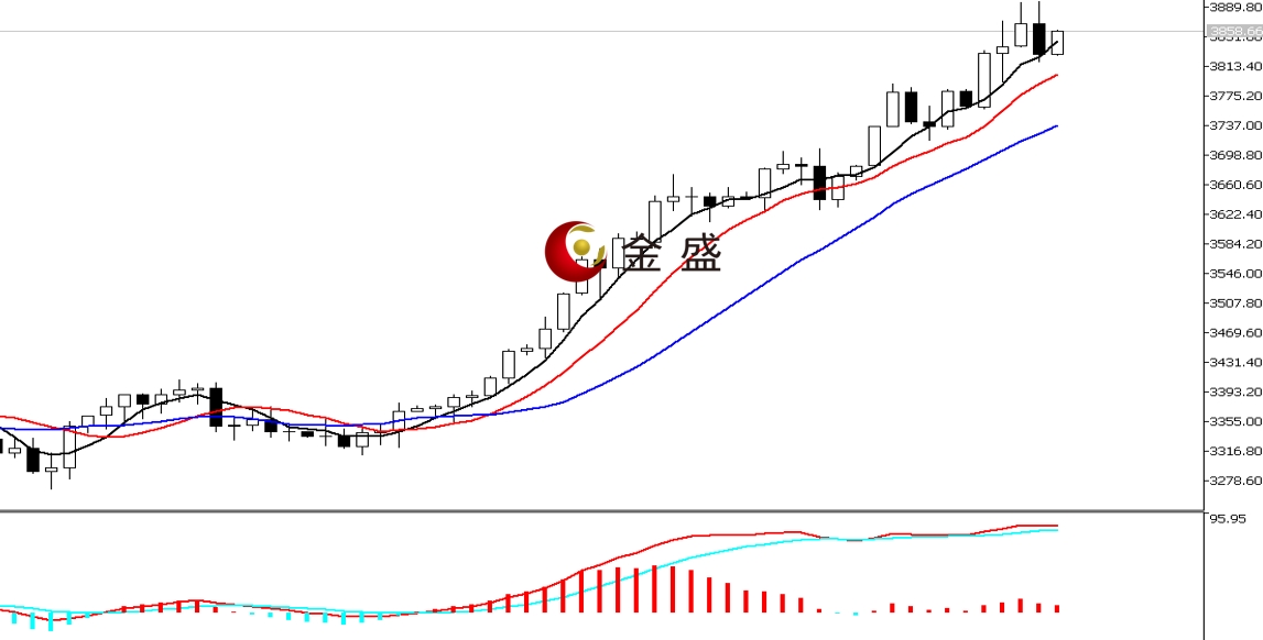 前一个交易日,早盘时段,黄金依托3850美元一带横盘休整数小时,午后持续攀升。晚盘时段,行情短暂上冲创新高3896.53美元,随后出现跳水走势,一小时下挫五十美金,价格跌破多个关口,最低至3820美元,尾盘强势反扑,收复日内大部分跌幅,最终收长影线的阴星。均线系统多头排列,运行在价格下方形成支撑。MACD指标快慢线零轴上方现金叉,做多的动能减弱。黄金上行趋势不变,价格连续两次受阻3900美元一带,且昨日调整的空间有增强,可见多头有抛售嫌疑。美中不足的是阴线实体偏小,高位反转信号不明显。短期看3820—3900区间震荡,操作上低吸为主,高抛为辅。