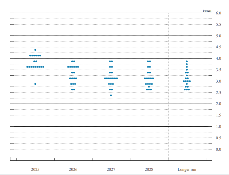 美联储6月18日会议维持基准利率在4.25%-4.50%不变,连续第四次会议按兵不动,符合市场预期。另外,美联储点阵图显示,2025年预计将降息两次共50个基点,与三月份预期一致,但2026年预计仅将降息25个基点,而此前预测为降息50个基点。