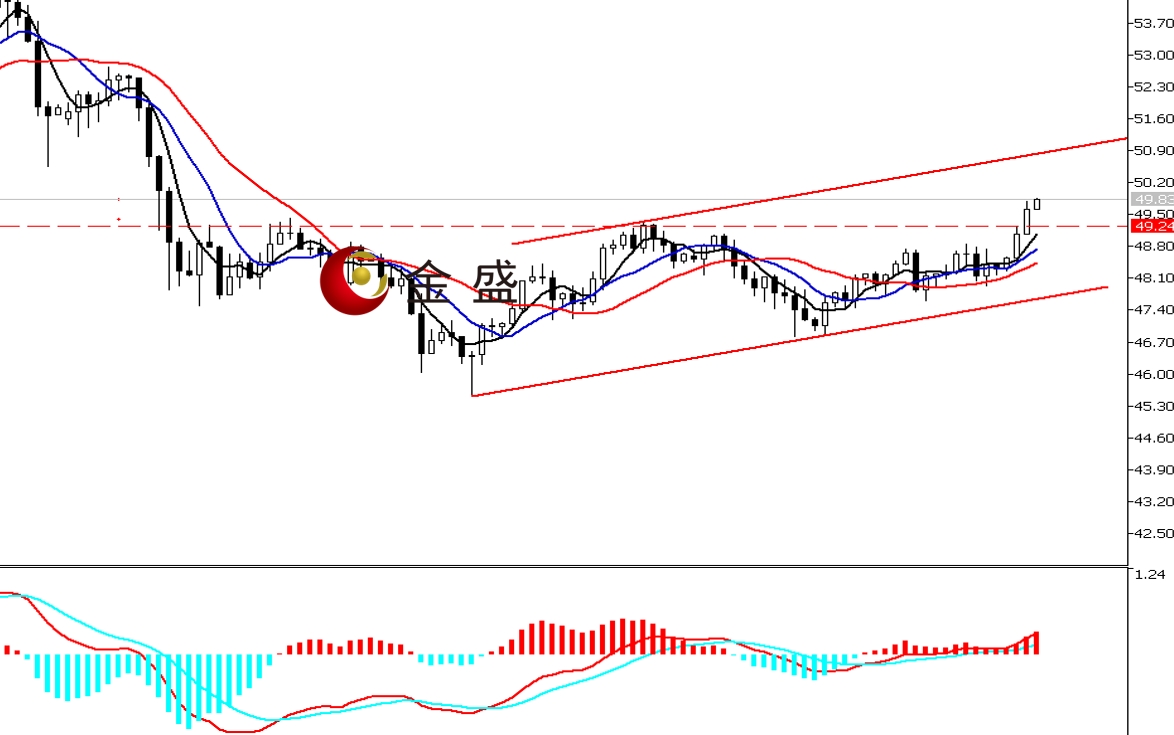 前一个交易日,白银走势与黄金同步,行情在白盘持续上行,晚盘回吐部分涨幅,最终收涨0.68%。今天白盘行情延续涨势,多头早盘突破49美元关口,午后加速上行至50美元附近,日内涨幅逾3%。四小时周期,均线系统收敛向上拐头,对价格上行构成支撑。MACD指标快慢线零轴附近现金叉,做多的动能增强。白银走势符合上周预期,价格形成V型突破,确认反弹升级。行情运行在图示的通道内,后市关注结构上轨的压力。