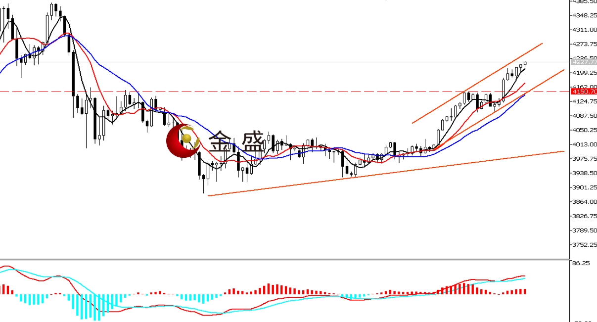 现货黄金周四(11月13日)开市于4195.22美元/盎司。亚欧盘时段,美指反弹乏力,午后再度下挫逼近99美元大关。黄金维持强势格局,价格早盘围绕4200美元一带横盘蓄势,午后再创周内新高。截止目前,金价最高4236.2美元/盎司,最低4179.91美元/盎司。黄金突破4150美元一带,确认U型底成立,反弹高度再度打开。昨日拉升逾100美金,今天无明显调整,可见短期多头动能强劲,暂时不宜博空。行情加速走高,形成新的上行通道,短期关注上轨4250美元一带的压力。