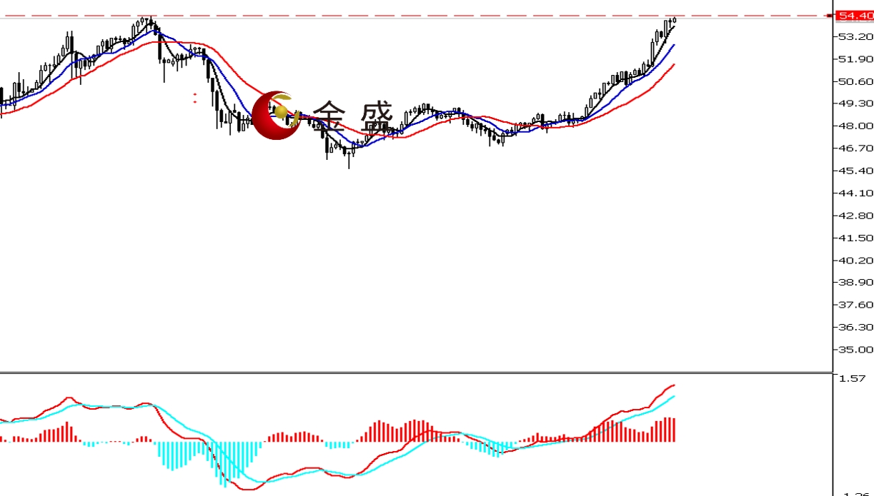 前一个交易日,白银延续强势,价格坚守51美元关口持续上行,盘中接连打破多个关口,最终收涨4%。今天白盘行情短暂休整后再度上行,午后突破54美元大关。四小时周期,均线系统收敛向上拐头,对价格上行构成支撑。MACD指标快慢线零轴附近现金叉,做多的动能为主。白银周内大涨逾10%,价格重回前高一带。技术形态呈现U型底结构,短期关注前高的真假破位,等待假突破信号出现后博弈空单。