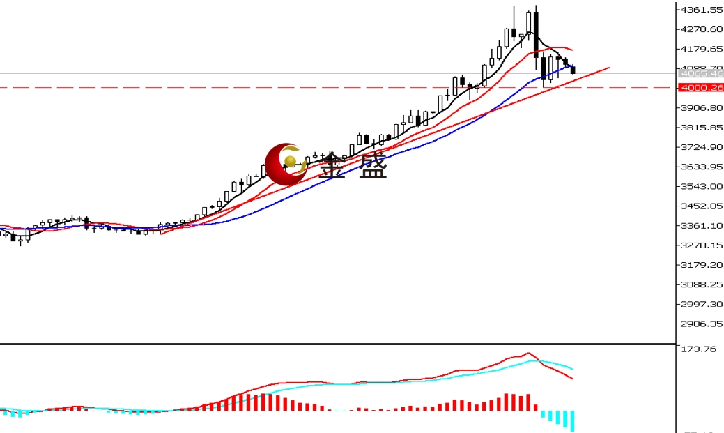 前一个交易日,白盘时段,黄金依托4100美元关口横盘休整,盘中创当日高点4144.14美元。午后连续阴线下挫近一百美金。晚盘时段,行情创当日低点4044.34美元,cpI数据不及预期,强化降息预期。黄金持续反扑收复日内大部分跌幅,最终收长下影的阴K。均线系统不断收敛,价格回踩布林带中轨。MACD指标快慢线零轴上方现死叉,做空的动能为主,指标有调整需要。黄金上行趋势不变,价格运行在图示的支撑线之上。行情高位休整三日,技术形态呈现收敛结构。今天早盘避险降温,金价低开低走,短期关注四千关口的得失,操作上高抛低吸。
