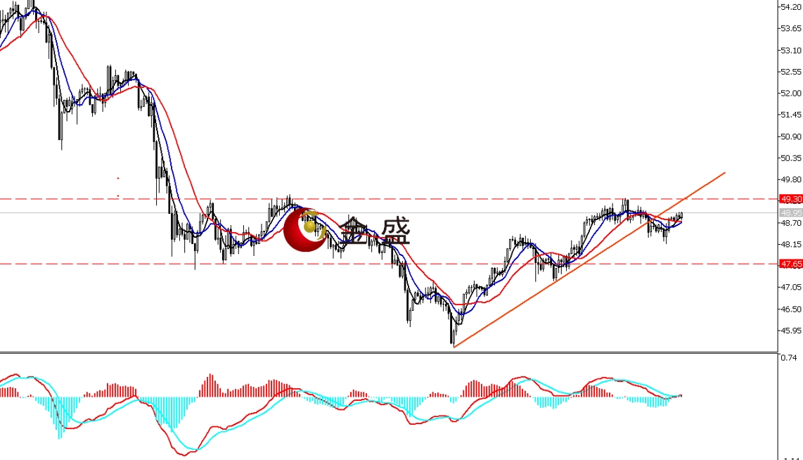 前一个交易日,白银先涨后跌,价格受阻于多空分水岭回落,最终收跌0.47%。今天早盘行情继续调整至48美元附近止跌回升,午后收复上周五大部分跌幅。四小时周期,均线系统不断收敛,价格围绕其震荡。MACD指标快慢线零轴上方走平,做空的动能衰竭。上周五白银如预期未能突破关键压力位,随后调整跌破图示的反弹趋势线,确认短期多头力度放缓。行情或构筑头肩底雏形,颈线位于49.2美元一带,左右肩参考47.6美元关口,操作上调整做多为主。