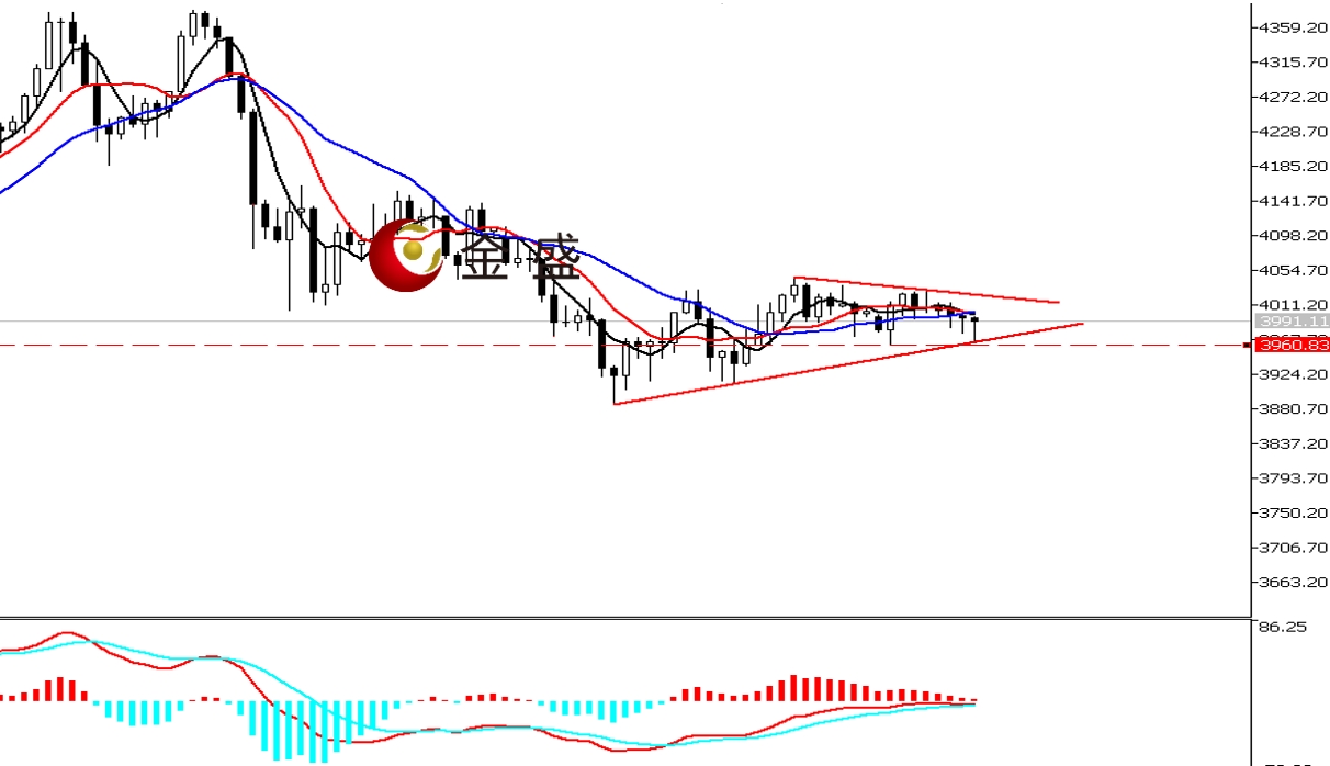 前一个交易日,美国10月份制造业活动连续第八个月萎缩,美指继续反弹再收阳。黄金全天围绕四千关口震荡,早盘低开高走上演V型反转,欧美盘有所调整回吐当日部分涨幅,最终收小K线。今天白盘行情先跌后涨,走势延续昨日的K线内震荡。四小时周期,均线系统收敛走平,价格围绕其盘整。MACD指标快慢线零轴附近运行,做多的动能衰竭。昨日晚间黄金在有经济数据利好的加持下,价格不涨反跌,可见短期多头上攻意愿不强。走势形成图示的收敛三角形结构。今天午后回踩下轨有反抽,短期关注区间如何打破,操作上调整做多为主。