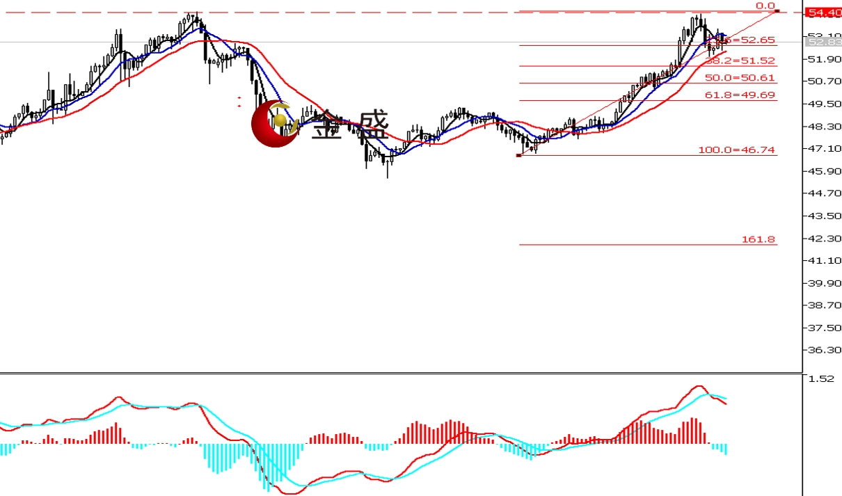 前一个交易日,白银走势与黄金同步,行情先涨后跌,盘中一度重返前高54.4美元一带,美盘持续下挫回吐全部涨幅,最终收跌1.85%。今天白盘多头有所反扑,盘中收复昨日一半跌幅,多空围绕53美元关口争夺。四小时周期,均线系统收敛向上拐头,对价格上行构成支撑。MACD指标快慢线零轴附近现死叉,做空的动能为主,指标有调整的需要。昨日白银在前高出现大幅回落,二次确认54美元上方压力强劲。技术形态有双顶的雏形,行情可能对前一波上涨的技术性调整。
